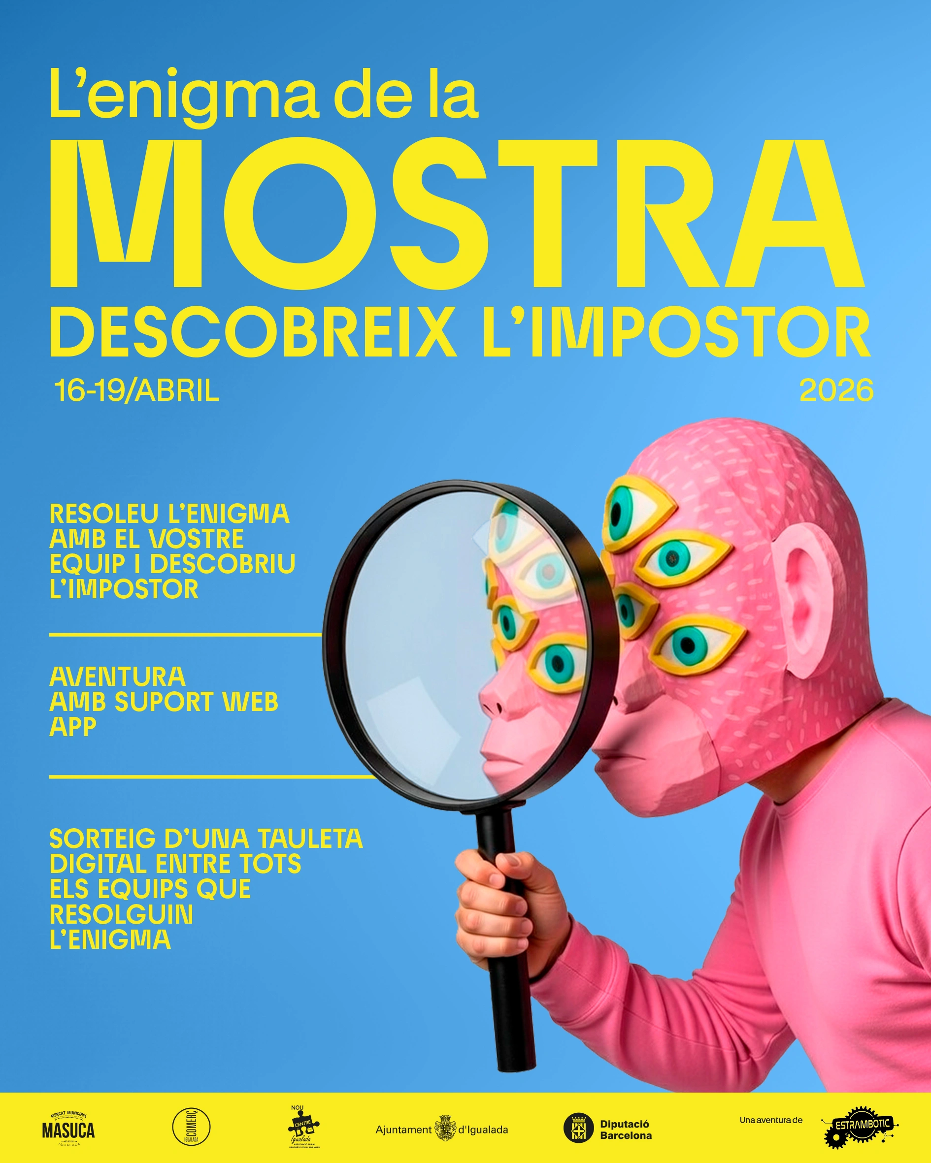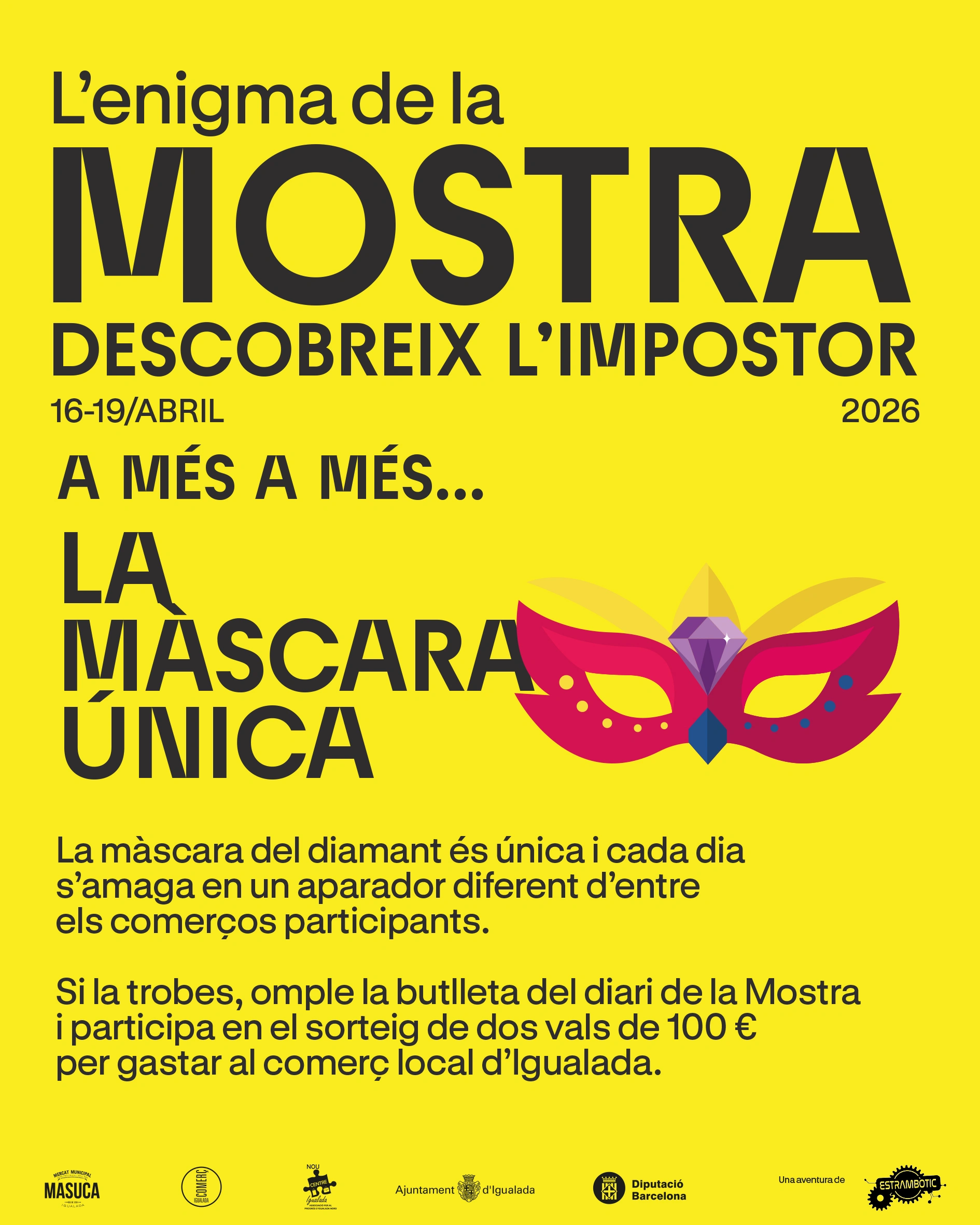 A la Mostra, just abans que comenci la funció, un impostor ha alterat l’escenari i ha fet desaparèixer objectes clau, deixant actors i públic en suspens. Tu i el teu equip heu de seguir les seves petjades pels carrers d’Igualada, on cada aparador pot amagar una pista, en una aventura que us acosta pas a pas a descobrir la veritat. Esteu preparats per descobrir l’impostor?