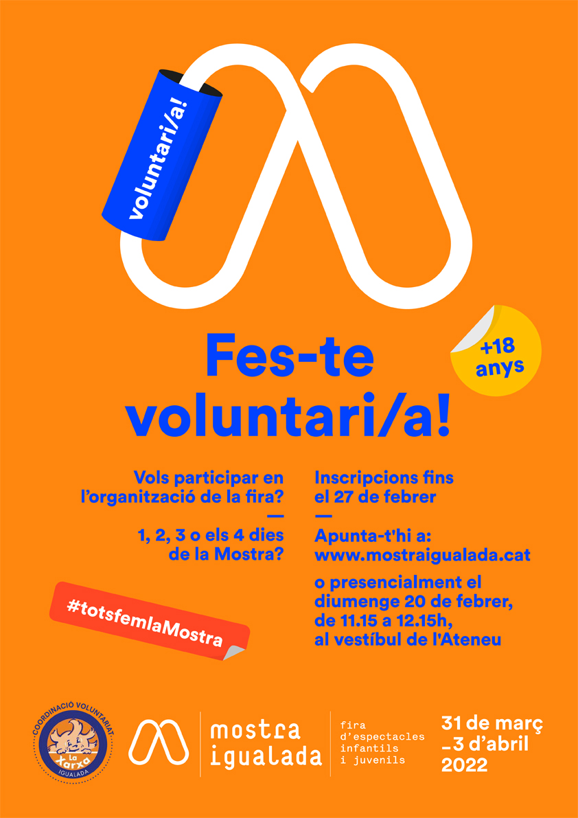 - Fins el 27 de febrer els voluntaris es poden inscriure a www.mostraigualada.cat o presencialment el diumenge 20 de febrer d’11.15 h a 12.15 h al vestíbul de l’Ateneu