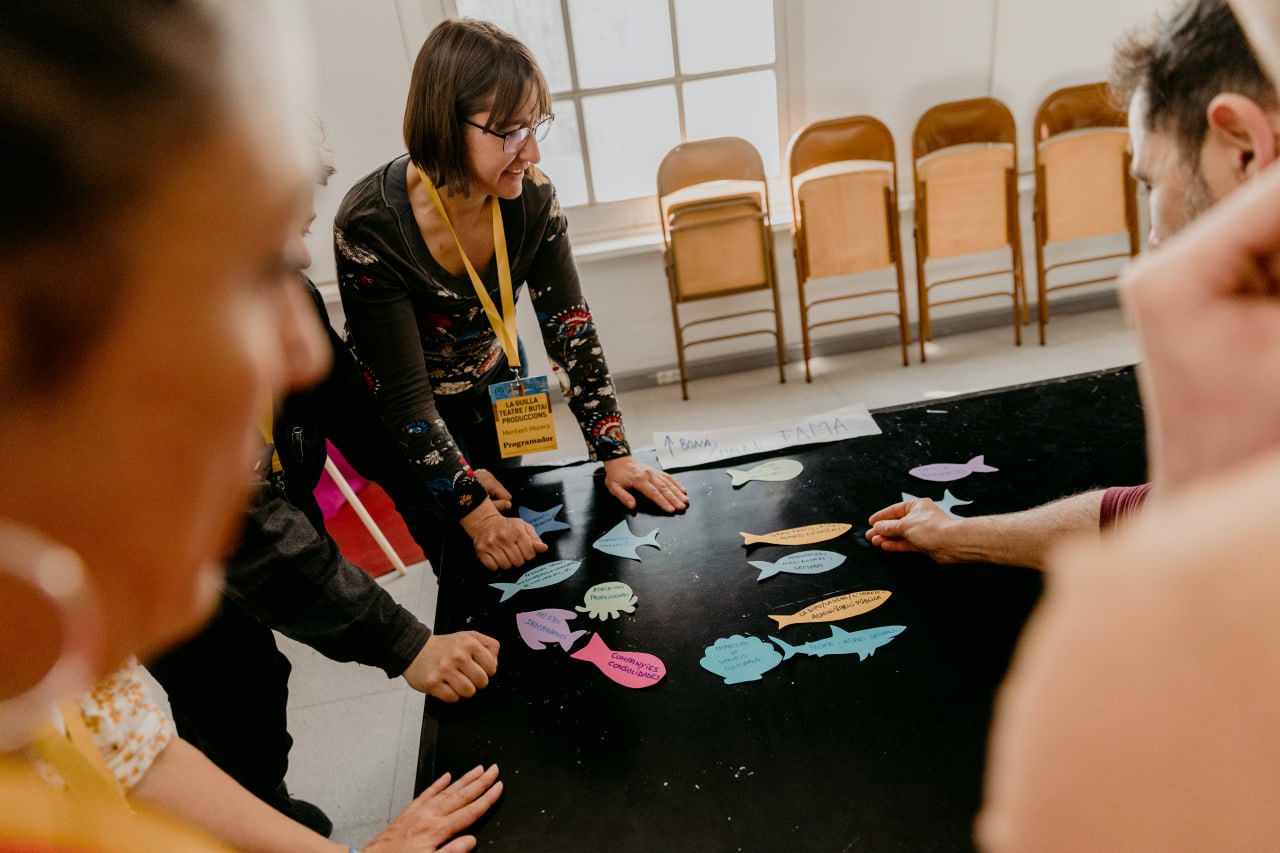 A diferència de les accions anteriors a espais com Escena Poblenou o el Festival Z, en què una dinàmica participativa servia per sacsejar entre cinquanta i setanta assistents i fer-les debatre sobre un tema en concret, l’activitat que L’Última Merda Col·lectiu presenta a la Mostra PRO Catalan Arts d’enguany té un format molt més gran. Prop de cent cinquanta persones (un èxit de convocatòria facilitat pel fet que la Mostra ha programat aquesta activitat en un horari en què no s’encavalca amb cap altra), dividides aleatòriament en setze grups, aniran rotant per cinc activitats diferents, que les faran reflexionar sobre l’estructura del sector; els espais de creació i de compravenda, i les relacions que els diferents agents hi estableixen. I els grups, com que som a la Llotja, duran el nom de diferents tipus de peix. I és que totes hem sentit algun cop que alguna col·lega és una mica bruixa, que la burocràcia ens té rostides com sardines, que el nostre catxet mai sembla prou verat o que negociar amb les administracions és diàleg de besuc.
