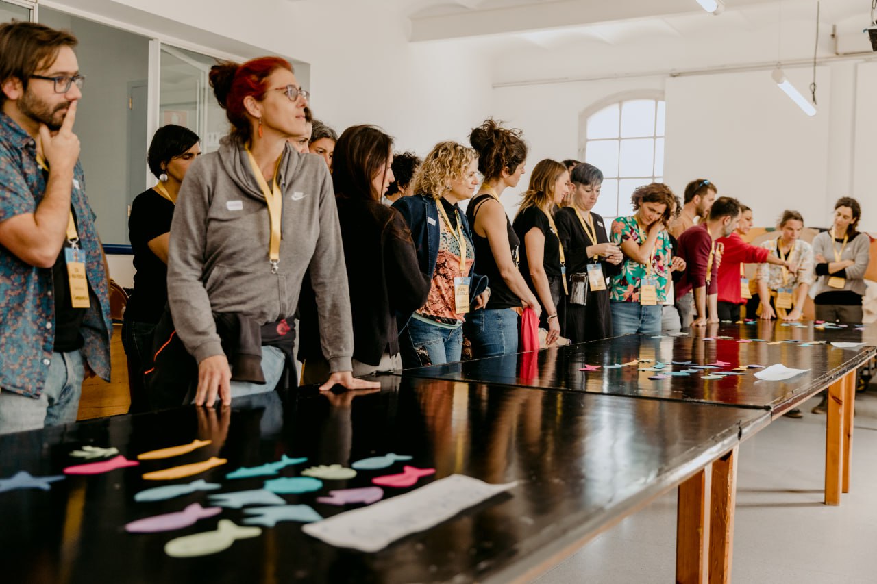 És als espais com la Mostra PRO Catalan Arts on tenim el deure de fer casar les necessitats mercantils amb un tracte humà i coherent amb la nostra matèria de treball: l’art i la cultura. Com s’han de dissenyar els espais professionals per facilitar vincles d’empatia entre artistes, programadores i altres agents? Quan fem aquesta pregunta, constatem amb alegria que, per a moltes de les assistents, la primera resposta és “contractant L’Última Merda”. I és que els “espais de joc” i “propostes interactives” com aquestes permeten pensar d’una manera desjerarquitzada i conèixer gent nova i d’altres àmbits sense parlar necessàriament de feina, des d’un to més personal. “Cal trencar jerarquies”, aquesta és l’afirmació d’una participant i que la immensa majoria comparteix. Les acreditacions dels festivals, per exemple, són molt útils per identificar qui és qui (sobretot, es comenta, si duen la lletra gran i estan impreses a banda i banda), però també poden generar rols de poder. En aquest sentit, es valora que a la Mostra siguin totes del mateix color. També el rol de la FacilitaPRO Margarida Troguet, que fa de guia a l’hora de generar vincles entre agents desconegudes. “Hay que cambiar el jerarquizar por el identificar”, resumeix una assistent. Una altra manera de diluir les jerarquies és fomentant l’ús dels espais naturals de trobada, com ara el bar, però també posant-los en el centre, com a part de les activitats professionals en horari diürn, allunyant aquestes converses de la clandestinitat en què solien estar.
